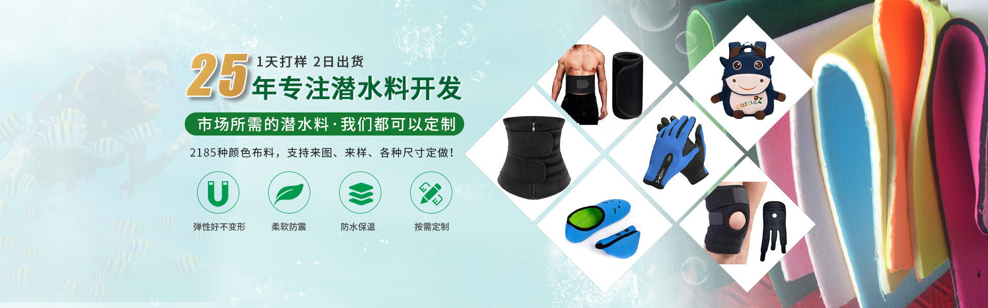 其生產的SBR、CR、Neoprene潛水料系列廣泛應用于電腦袋、相機包、運動護具、沖浪衣、潛水衣、釣魚褲、腰帶、手臂帶、鼠標墊、瑜伽墊、杯套、鞋材等多種產品領域,市場應用前景廣闊。